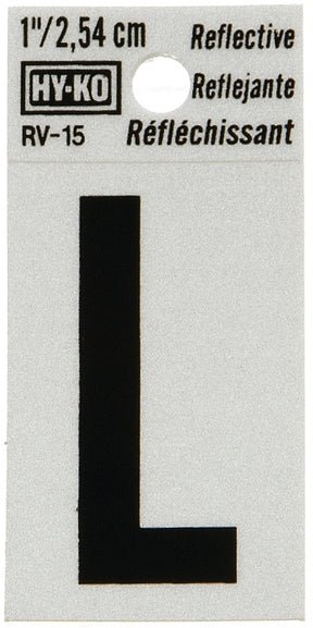 Hy-Ko RV-15/L Reflective Letter, Character: L, 1 in H Character, Black Character, Silver Background, Vinyl, Pack of 10 is backordered and will ship as soon as it is back in stock.