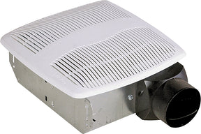 White polymeric grill. One-piece polymeric wheel. Plastic collar for 3 in duct connection, comes complete with built-in non-metallic back draft damper for quiet operation. Rated for ceilings insulated to R-40. UL listed for installation over a tub or shower on a GFCI circuit. HVI2100 certified. Grill dimension of 10 x 9-1/2 in. Housing dimension of 7-1/4 x 7-1/4 x 3-3/4 in.