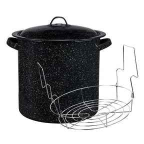 Graniteware canner with jar rack holds all size canning jars. Great for canning smaller batches. Provides excellent heat distribution for reduced heat-up time. Perfect for preserving fruits, pickles, relishes, jams, jellies, marmalades and salsa.