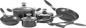Non-stick interior with tempered glass covers. Set includes 5 qt. covered Dutch oven, 8 in and 10 in fry pans, 1 qt and 2 qt covered sauce pans and slotted spoon and spatula. Dishwasher-safe.