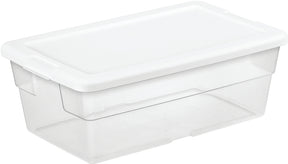 The 6 qt storage box features a clear base that allows contents to be easily identified. The opaque lid snaps firmly onto the base to keep contents contained and secure. This storage box is ideal for storing shoes and other small items around the home and fits conveniently on 16 in wire closet shelving, making it ideal for organizing and storing small items in the closet.