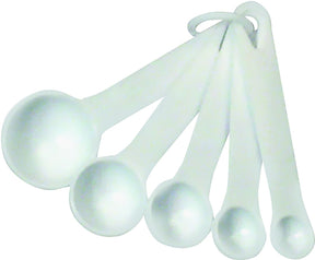 This Chef Craft 6-piece white measuring spoon set includes 1/8 tsp, 1/4 tsp, 1/2 tsp, 1 tsp, 1/2 tbsp and 1 tbsp sizes. Each spoon also has metric measurements to suit any recipe. The measurement labels are molded into the plastic so they will not rub off. These spoons are dishwasher-safe.