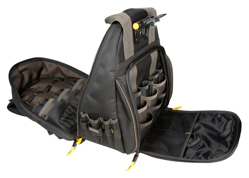 Our CLC Tech Gear dual compartment 53 pocket LED lighted tool storage backpack features an integrated three level LED light that swivels, two straps for cordless drill/driver and battery charger, carrying handles, padded shoulders with sternum strap and back padding.