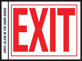 White sign states "EXIT" with red letters made of phosphorescent material with non-radioactive chemical that glows in total darkness after exposure to a light source. Self-adhesive.
