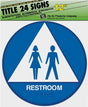 For architectural, commercial or decorative use. Meets Title 24 requirements. Blue background with white emblem and lettering. States "RESTROOM." Unisex sign features both male and female emblems. Uses braille. Includes self-adhesive strips for mounting.