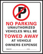 Red and black letters on white background. Sign states "NO PARKING UNAUTHORIZED VEHICLES WILL BE TOWED AWAY AT VEHICLE OWNERS EXPENSE".