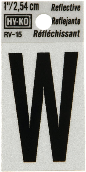 Hy-Ko RV-15/W Reflective Letter, Character: W, 1 in H Character, Black Character, Silver Background, Vinyl, Pack of 10 is backordered and will ship as soon as it is back in stock.