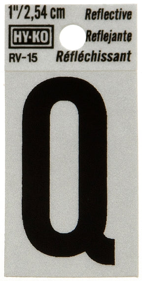 Hy-Ko RV-15/Q Reflective Letter, Character: Q, 1 in H Character, Black Character, Silver Background, Vinyl, Pack of 10 is backordered and will ship as soon as it is back in stock.