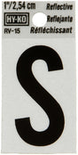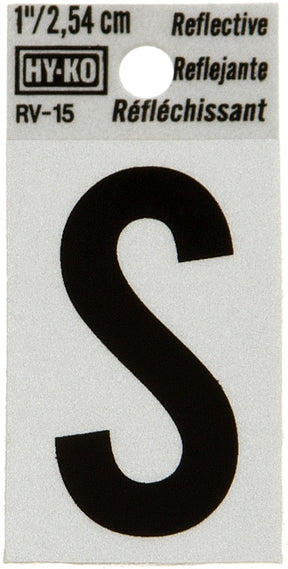 Hy-Ko RV-15/S Reflective Letter, Character: S, 1 in H Character, Black Character, Silver Background, Vinyl, Pack of 10 is backordered and will ship as soon as it is back in stock.