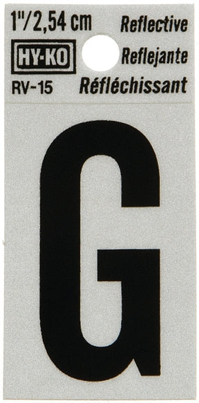 Hy-Ko RV-15/G Reflective Letter, Character: G, 1 in H Character, Black Character, Silver Background, Vinyl, Pack of 10 is backordered and will ship as soon as it is back in stock.