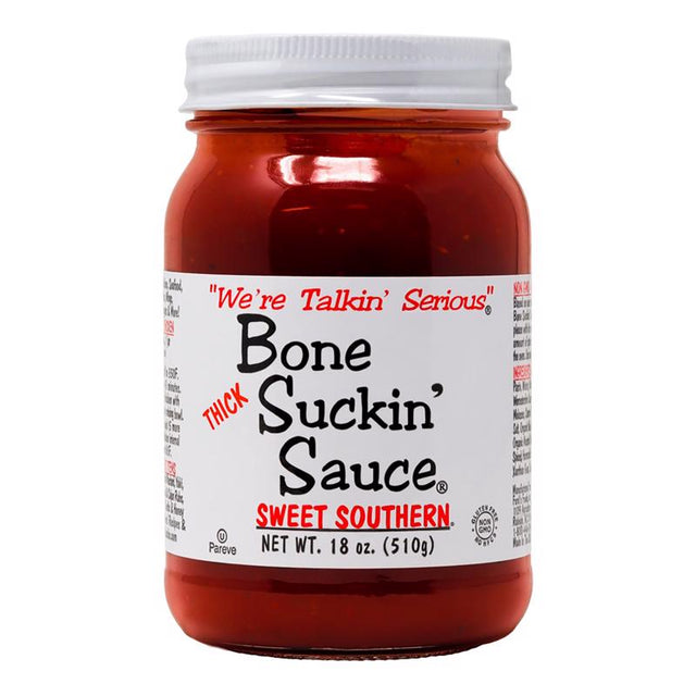 This is a tangy, sweet, tomato-based BBQ sauce, sweetened with honey and molasses. A thicker version of our original Bone Suckin' Sauce.