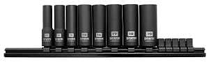 Irwin Socket Rail Set, Impact, Specifications: 3/8 in Drive Size, Molybdenum Steel, Black Oxide, Number of Pieces: 8, Suitable for: 3/8 in Square Drive, Includes: 10mm, 11mm, 12mm, 13mm, 14mm, 17mm, 18mm, 19mm Socket