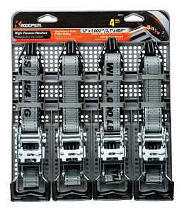 Keeper 12 ft x 1 in Ratchet Tie-Down with coated double J-Hooks is ideal for commercial cargo management. With a 1000 lb. working load limit and 3000 lb. break strength, this product is perfect for applications such as bundling pipes or lumber to truck racks. The compact, steel double J-hooks attach to anchor points, making it versatile and easy-to-use. Keeper Hi-Test webbing is designed to perform under the most demanding conditions. Safety comes first, with a spring-loaded ratchet to ensure no accidental opening. Keeper is the best solution for all your cargo management needs. Available in a 4 pack.