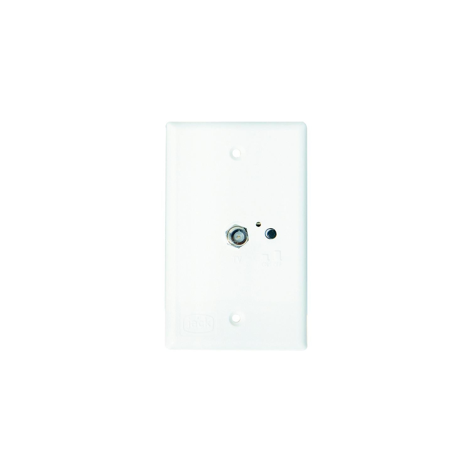 Twelve volt DC power supply for amplified antenna with flush wall mount plate. Inputs for TV antenna and cable with built-in selector switch. F-type connectors for 2 TV outputs.
