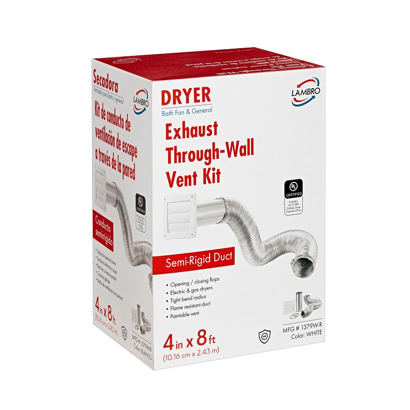The Lambro white plastic louvered clothes dryer exhaust vent kit featuring 4 in x 8 ft semi-rigid duct UL 2158A is ideal for venting through the wall. This kit is used for clothes dryer exhaust and other general venting applications that require moist air and humidity from exiting the home. The built in flaps prevent back drafts and prevents critters from entering the home through the vent. The plastic vent has a UV additive to prevent premature fading due to the sun.