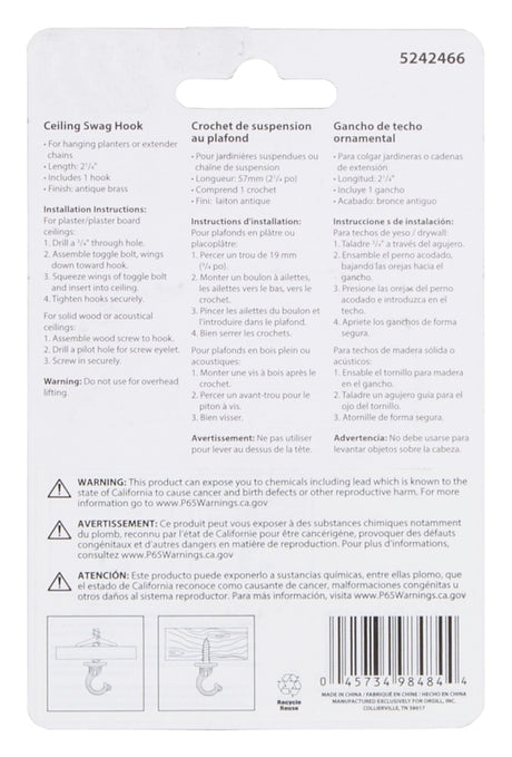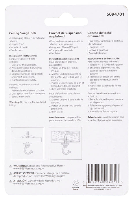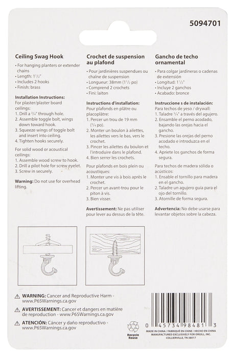 Landscapers Select GB0083L Ceiling Hook, 2-3/16 in H, Zinc, Brass, Brass, Ceiling