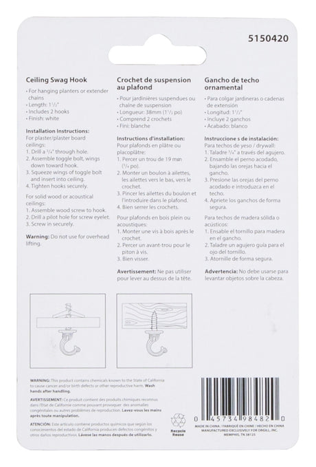 Landscapers Select GB0093L Ceiling Hook, 2-3/16 in H, Zinc, White, White, Ceiling
