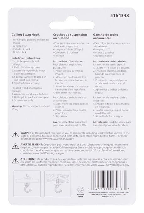 Landscapers Select GB0433L Ceiling Hook, 1-1/2 in L, 1 in H, Steel, Black, Black-Coated, Wall