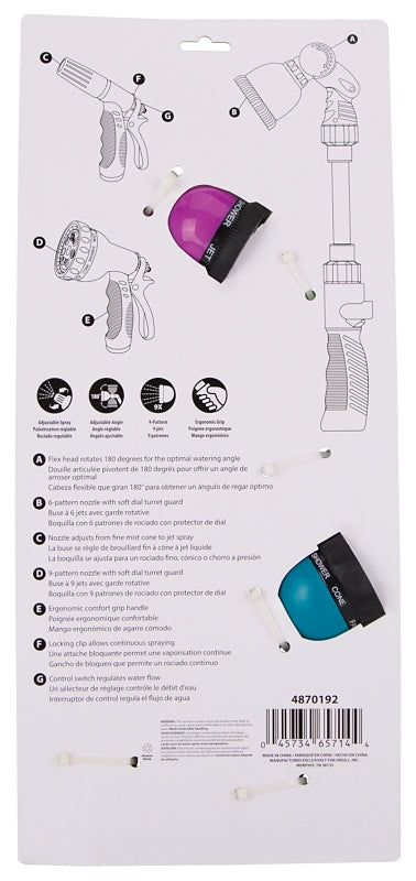 Ergonomic comfort grip handle. 3-piece nozzle set includes one 6 pattern adjustable angle spray nozzle with soft dial turret guard. Flex head rotates 180 deg for the optimal water angle, one Adjustable spray nozzle that adjusts from fine cone to jet spray. The locking clip allows continuous water flow and a control switch to regulates water flow and one 9 pattern spray nozzle with soft dial turret guard, a locking clip which allows continuous water flow and a control switch to regulate water flow.