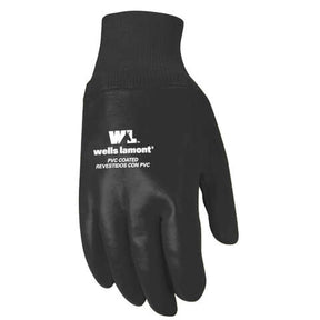 Commercial/industrial glove. Black color PVC (polyvinyl chloride) coated, cotton lined, smooth non-slip finish, wing thumb and knit cuff. Resists solvents, caustics, light oils, salts, grease, soaps, detergents, and dyes.
