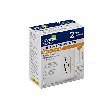 Leviton Decora 15 amps Type A/C Duplex White Outlet and USB Charger 5-15 R 2 pk