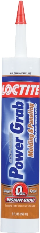 Loctite Power Grab Express molding and paneling construction adhesive is a premium quality, high strength, gap-filling adhesive. This construction adhesive has 0 sec instant grab and dries faster than power grab clear. It will bond paneling, drywall, molding, corkboard, ridged PVC and hardboard to a variety of surfaces. This extremely high tack adhesive reduces the need for nails and screws in many DIY projects and repair jobs. The adhesive has a very low odor and requires only soap and water to cleanup. This makes it safe, easy-to-use and environmentally friendly. Loctite power grab xpress molding and paneling is also third party GREENGUARD Indoor Air Quality Certified and GREENGUARD Certified for Children and Schools.