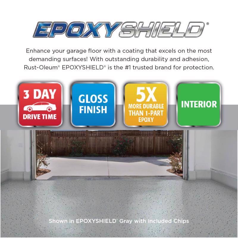 Rust-Oleum EpoxyShield Garage Floor Coatings are specially formulated to provide superior adhesion and durability. Coatings are easy to apply and produce professional-looking results. Applies in one easy coat and protects against stains, cracking and wear.