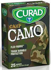 Curad kid's adhesive bandages help make kids smile. These latex-free adhesive bandages are designed to fit kid-sized wounds and fun colors and characters help turn frowns upside down. Box of 25 camouflage green bandages. Dimension of 3/4 in x 3 in.