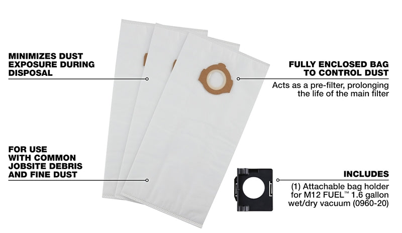 Our fleece dust bags are compatible with the Milwaukee M12 FUEL 1.6 gal wet or dry vacuum and the M18 FUEL PACKOUT 2.5 gal wet or dry vacuum. These disposable fleece dust bags are ideal for fine dust collection. The vacuum bags are fully enclosed and act as a pre-filter to prolong filter life and are easy for you to dispose of. This kit includes three fleece dust bags and the bag attachment for 0960-20 vacuum.