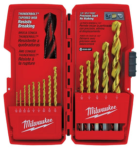The 14-piece Milwaukee Thunderbolt titanium-coated drill bit set offers convenience and heavy-duty performance on the jobsite. Milwaukee thunderbolt titanium-coated drill bits are designed for extreme durability and up to 3X longer life. The thunderbolt web features a thicker core than a standard drill bit to provide ultimate strength and protect against side-load breakage. The titanium coating reduces heat build-up and keeps the bit sharp to extend performance. A specially designed parabolic flute form clears chips and debris fast to keep the bit cool. The 135 deg split point tip delivers a precision start and prevents walking for fast, accurate holes. Effective for drilling on curved surfaces, Milwaukee thunderbolt titanium-coated bits require less effort to drill through wood, metal and PVC and are highly recommended for use with portable drills. The set comes in a resilient case and includes bit sizes 1/16 in, 5/64 in, 3/32 in, 7/64 in, (2) 1/8 in, 9/64 in, 5/32 in, 3/16 in, 7/32 in, 1/4 in, 5/16 in, 3/8 in and 1/2 in.