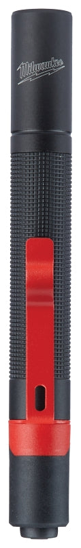 Delivers 100 lumens. A protective rubber bite zone lets users safely direct light while performing two handed tasks. Waterproof and dustproof. 6000 series aircraft aluminum body and lens are impact and corrosion resistant. Metal clip to attach to any chest or pant pocket. On/off and momentary-on buttons. 43 meter beam distance. IP67 Rated. Powered by (2) AAA batteries (included).