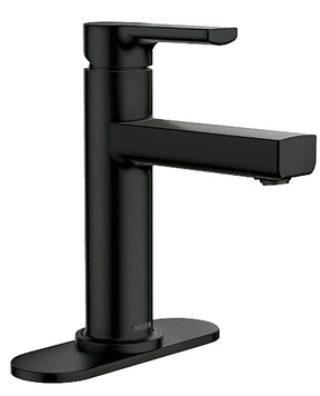 Moen Rinza Bathroom Faucet, 3/8 in Connection, Compression Connection, 1.2 gpm, 60 psi, Deck Thickness: 1-1/4 in, Spout Type: High Arc, Spout Reach: 4-7/16 in, Spout Height: 4-5/16 in, Lever Handle, Number of Faucet Handles: 1, Metal, Matte, Black, Number of Faucet Holes: 1, Faucet Hole Size: 1-1/8 in, Dimensions: 7-1/2 in H, Includes: Deckplate, Non-Metal Pushdown Waste Assembly