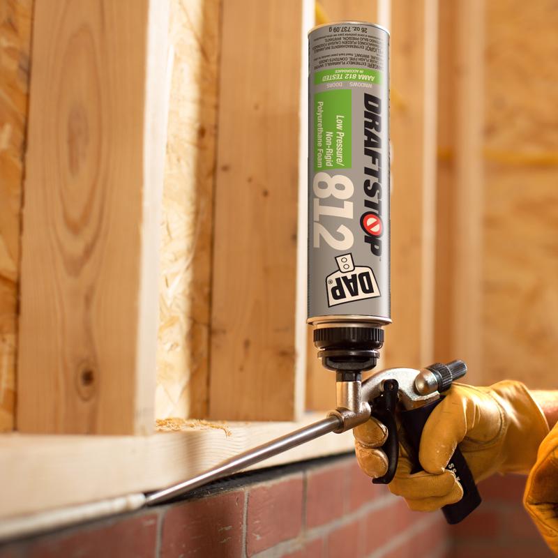 Draftstop 812 Low Pressure/Non-Rigid Polyurethane Foam is available in 26 oz. gun grade and 16 oz. Stop N Store straw grade canisters. Draftstop 812 is low pressure single component polyurethane foam designed to fill gaps between fenestration products and rough openings. It will provide an airtight seal and protect against water, air and sound intrusion. The non-rigid, highly elastic foam has 30% joint movement capability which accommodates movement and settlement to maintain an airtight, weather-proof seal. It is closed cell, minimal expanding foam which will not absorb water, warp or deflect window or door frames.