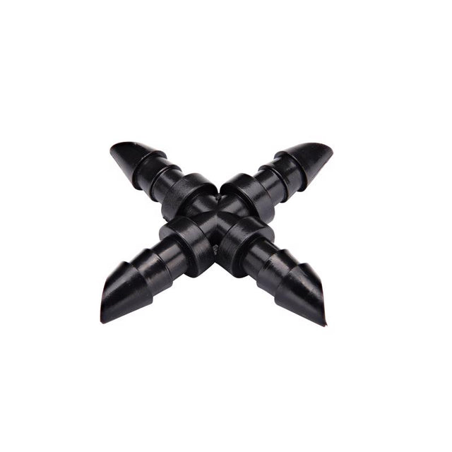 The 1/4 in. Barbed Cross connects four sections of 1/4 in. supply tubing or dripline for a "+" intersection. It also connects three 1/4 in. branches to a punched hole in any size supply line. To install, insert the single-barbed tee inside the drip tubing opening and anchor in place (Tip: soften the tubing end so it's easier to work with by soaking in hot water or leaving out in the sun for pliability).
