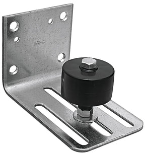 Designed for use as a heavy-duty guide on large, sliding doors up to 3-3/4 in thick. Slots in frame provide adjustment for holding doors against wood walls or posts. Delrin wheel is reversible; it can be used either side of frame. Offers sturdy steel frame construction. Meets ANSI/BHMA A 156.14. Roller is adjustable. Includes nail and lag screw holes. Hardened steel bolt for greater strength. Display packed.
