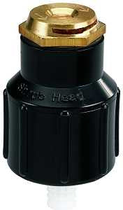 The plastic shrub head has a half-circle pattern brass nozzle with a flow-adjustment screw to adjust spray distance and water flow.