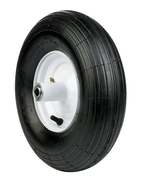 The Arnold WB-466 is a wheel. This is a pneumatic wheel with a centered hub and a ribbed tread pattern. It has a 2-ply rating and can hold up to 445-lbs. This wheel is 14 inches in diameter with a 400x8 inches tire. It has a 6-inch long hub and a 5/8-inch ball bearing. Its tough and solid design makes it durable and easy to use with a longer service life. It is made in the USA by Arnold, a trusted leader in the industry that integrates the finest components to complete the way you live.