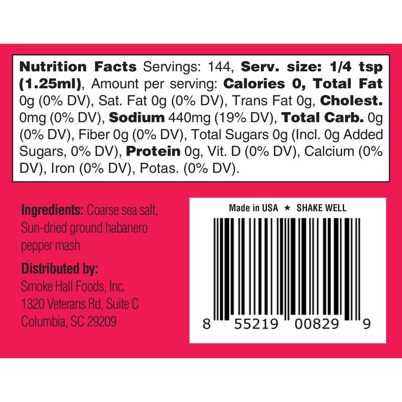 Ingredients are coarse sea salt and sun-dried ground habanero pepper mash