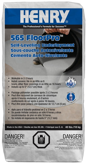 Henry Self-Leveling Underlayment, Net Content: 40 lb, Solid, Compositions: Crystalline Silica, Quartz, Portland Cement, Limestone, Calcium Aluminate Cement, Calcium Sulfate, Vinyl Acetate Copolymer, Calcium Hydroxide, Specific Gravity: 2.7 to 3.1, pH Range: 10 to 12, 22 to 44 sq-ft Coverage Area, Drying Time: 2.5 hr, Applicable Materials: Ceramic Tile, Concrete, Wood