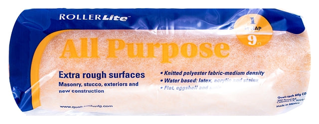 RollerLite All Purpose polyester knit fabric is designed for any interior or exterior surface and optimizes pick up and release for more paint capacity. Provides a consistent application. Strong and durable core. Ideal for semi-smooth surfaces with latex based paints and varnishes. For use with a 9 in cage frame.