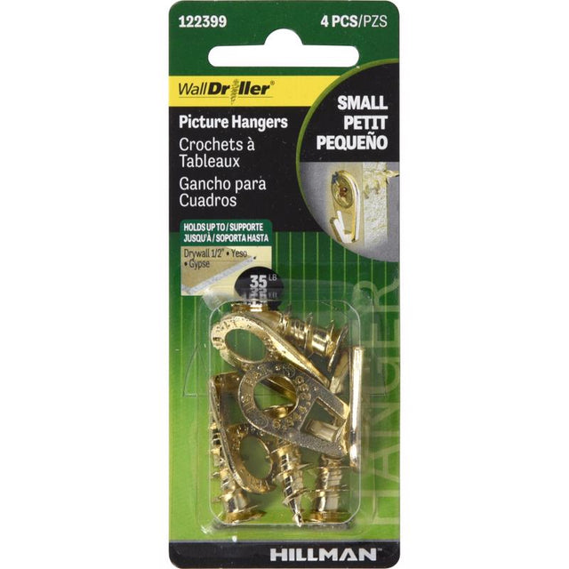 Hillman Self-Drilling Wall Driller Picture Hangers are easy to install and ensure a strong durable hold. Works great in drywall. First, mark drilling location. Use screw driver or power drill on the light setting to drill into place. Available in 35lb and 50lb weight ratings. Available in brass and white finishes. *