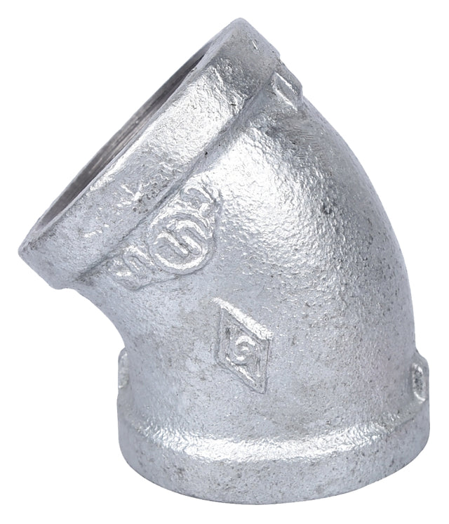 This galvanized 45 degree elbow is used to change direction in piping. It's suitable for use with water or steam. Flat banded, right hand threads.