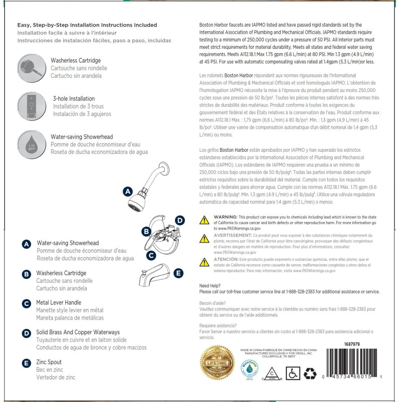 Boston Harbor TQ-F1014209CP Tub/Shower, Fixed Mount Showerhead, 1.75 gpm Showerhead, 1 Spray Settings, 1-Handle