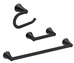 Made up of smooth, fluid curves, the Mikah collection offers a soft modern style that can add a touch of warmth to the bathroom. The three-piece accessory kit includes a 24 in towel bar, pivoting paper holder and towel ring to help complete the design of the space for a cohesive look. Available in matte black, a contemporary, yet surprisingly neutral, modern black finish.
