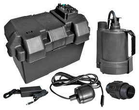 Superior Pump Battery Back Up Kit, Suitable For Use With: Sump Pumps, 12 VDC, Tethered Switch, 10 ft Cord, 1-1/4 in Discharge Size, Thermoplastic. Works with 12 V lead-acid, deep-cycle marine/RV and AGM batteries. Recommended minimum 40 Ah rating. Example Orgill SKU 7151525, Superior Pump number 99717.
