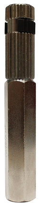 Nipple extractor for pipe nipples. Cam-style design fits into pipe and extends as it is turned, gripping the pipe from the inside to install or remove. Hex side allows tools a firm grip when using with wrenches.