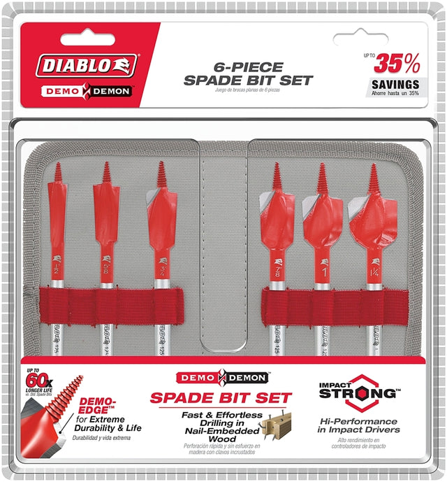 - Includes: (1) DSPD4010 1/2 x 6 in (1) DSPD4020 5/8 x 6 in (1) DSPD4030 3/4 x 6 in (1) DSPD4040 7/8 x 6 in (1) DSPD4050 1 x 6 in and (1) DSPD4070 1-1/4 x 6 in Diablos Demo Demontrade Spade Bit