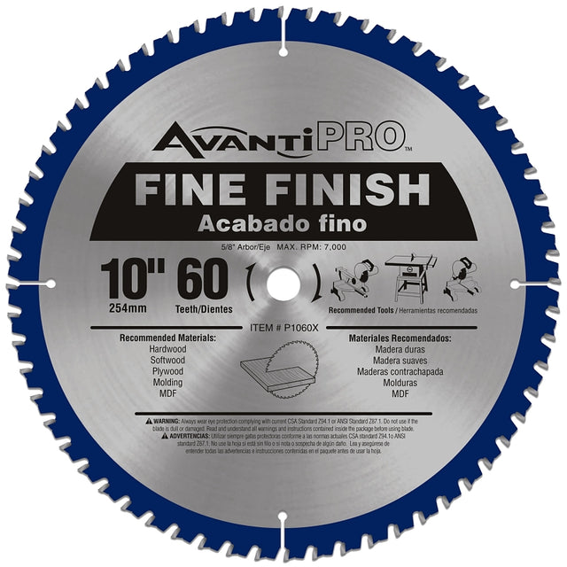 Avanti Pro Circular Saw Blade, 10 in Diameter, 0.071 in Thickness, Carbide Cutting Edge, Blue, ATB Teeth, 60 Teeth, 5/8 in Arbor, Fine Grade, 7000 rpm Speed, 7 deg Hook Angle, 0.095 in Kerf, Steel, Applicable Materials: Hardwood, MDF, Plywood, Softwood