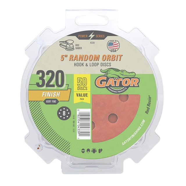 Gator 5 in random orbit sanding discs provide great finishing results and good value. These Red Resin discs are specifically designed for power tool use as they resist heat build-up and humidity for longer life. The quick change hook and loop holding system allows for easier and faster disc changing. The 8 hole vented pattern takes full advantage of the sander's dust collection systems keeping your work area cleaner.