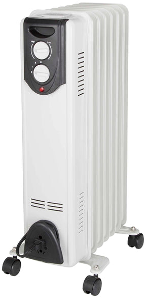 Oil filled heater has 600/900/1500W heat settings, adjustable thermostat, safety over heating protection, and safety tip-over switch. Mounted on four casters for easy movement. Front mounted cord wrap. Heavy-duty metal construction. ETL/CETL listed. Size: 24-3/4 in H x 9-1/2 in W x 14-3/4 in D.
